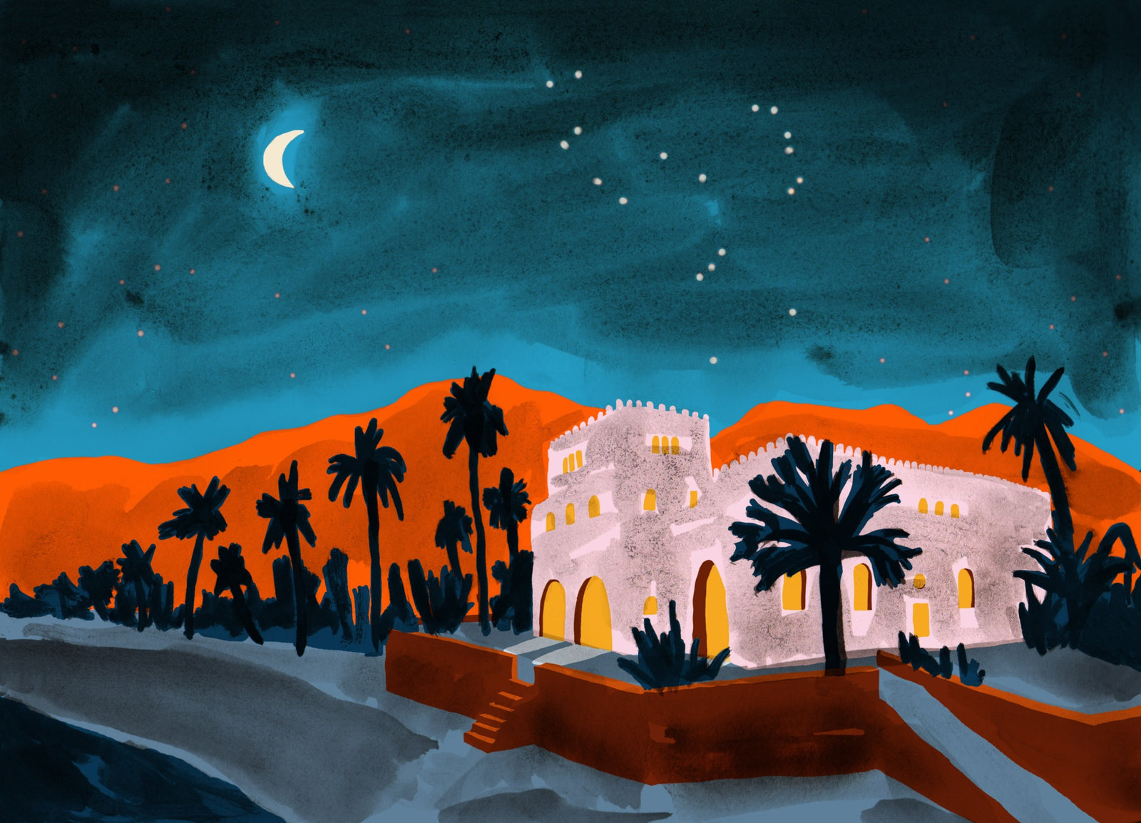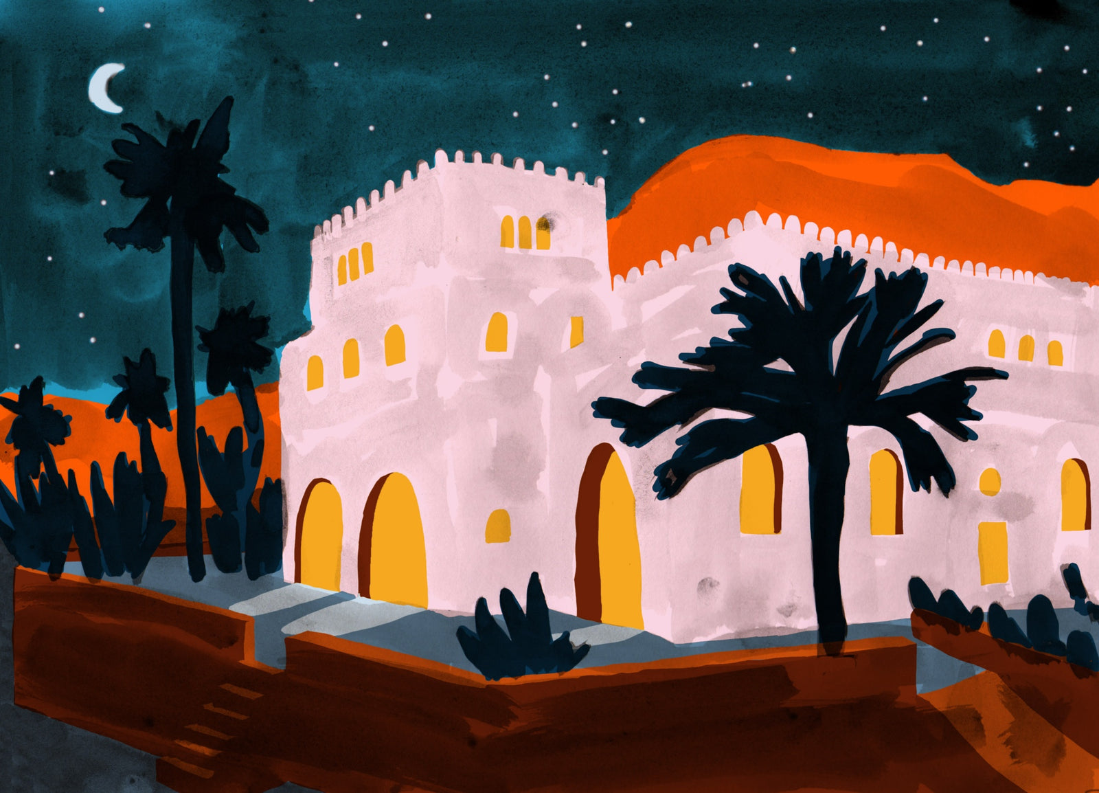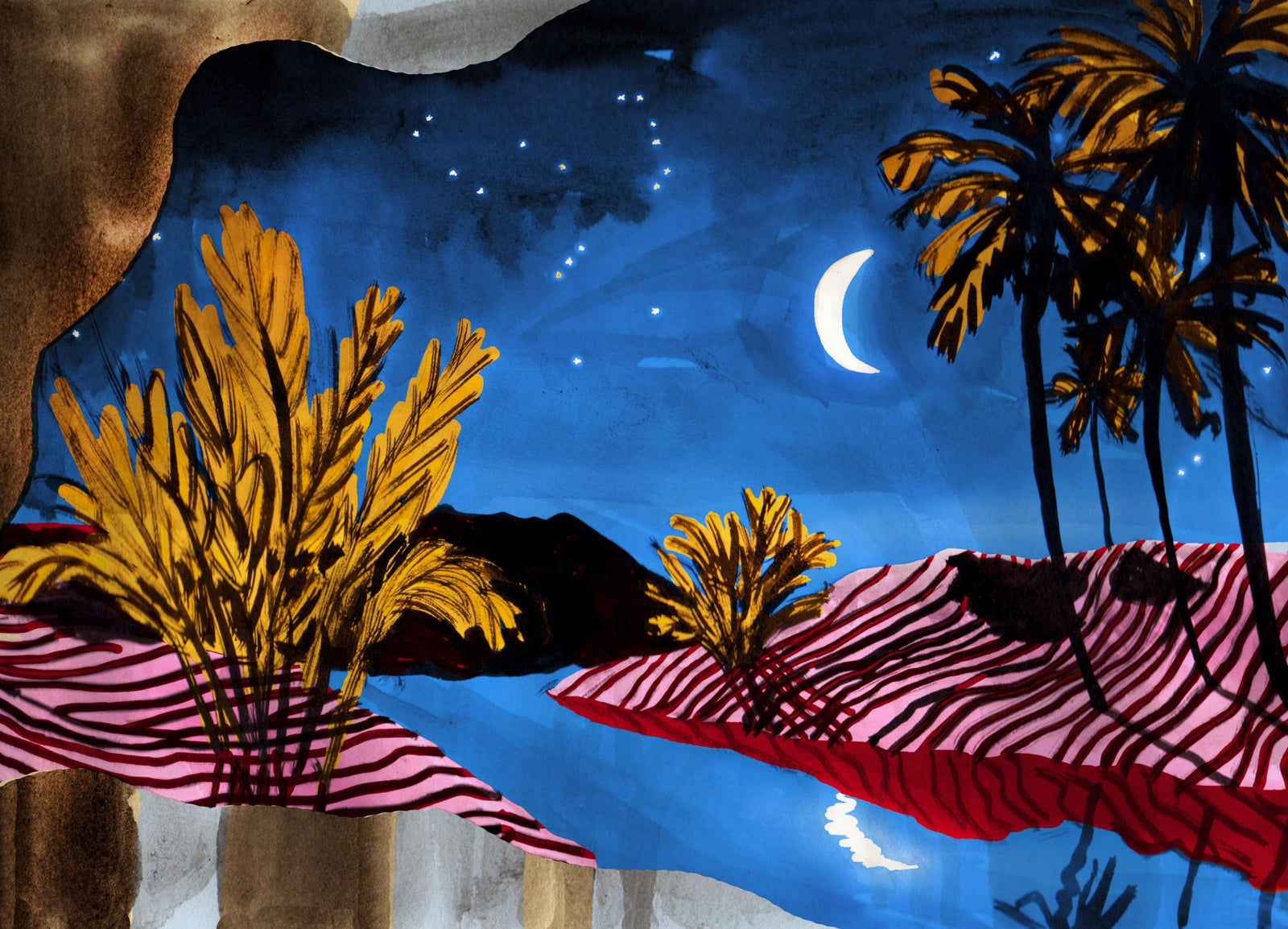 A painter and illustrator, she is equally at home creating editorial pieces that bring her comic strips to life as she is immersing herself in canvases rich in narrative and unique atmospheres. For Oriental Leather, the intensity and enveloping quality of the fragrance led her towards a nocturnal atmosphere, a dense palm grove, a mysterious palace, where every colour and every brushstroke, deliberate and full of life, creates an intensely sensory environment.